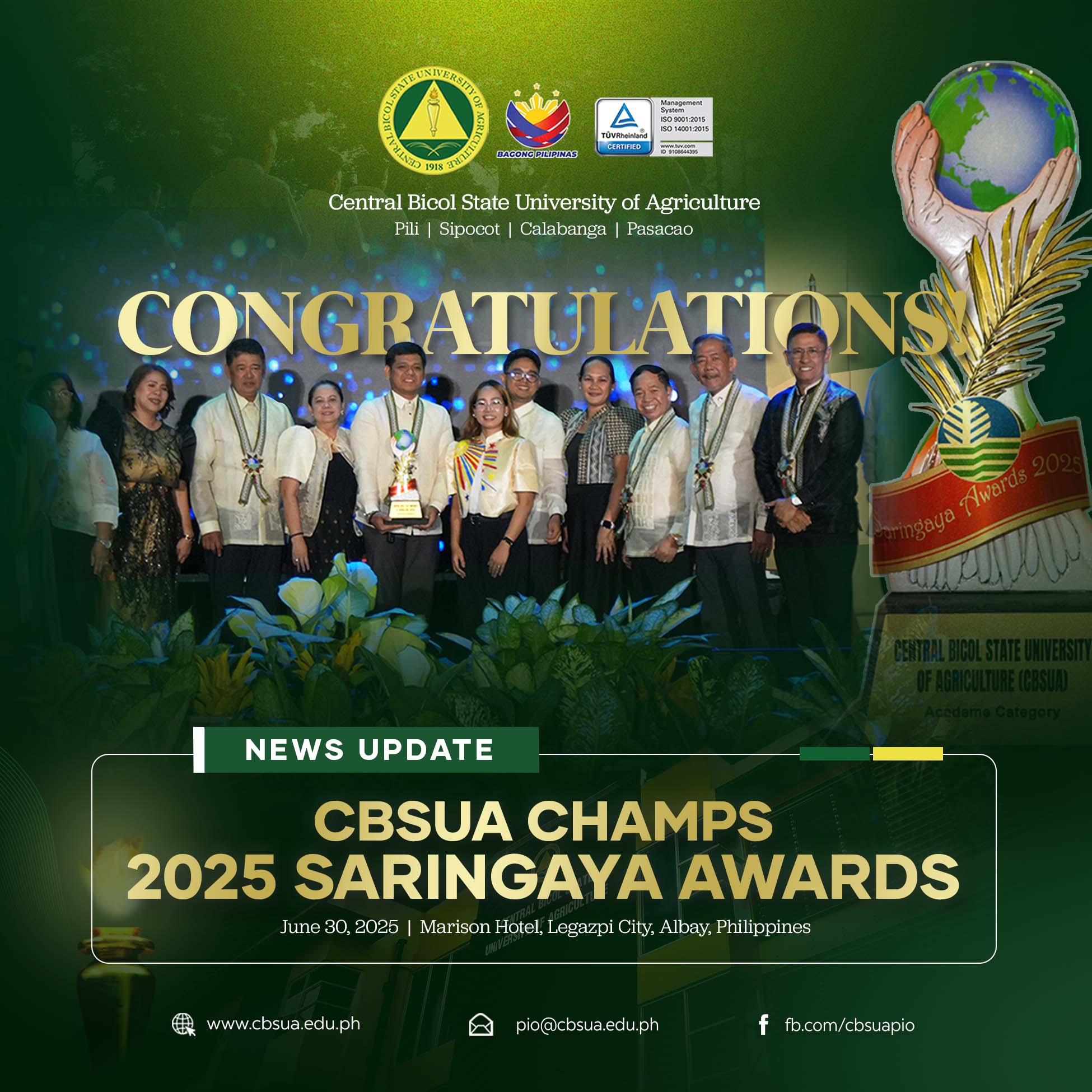 The Central Bicol State University of Agriculture (CBSUA) has proudly secured the championship in the Academe Category at the 23rd Saringaya Awards, held on June 30, 2025, at the Marison Hotel in Legazpi City, Albay. This prestigious win highlights CBSUA’s dedication and innovative efforts in preserving and conserving the planet.