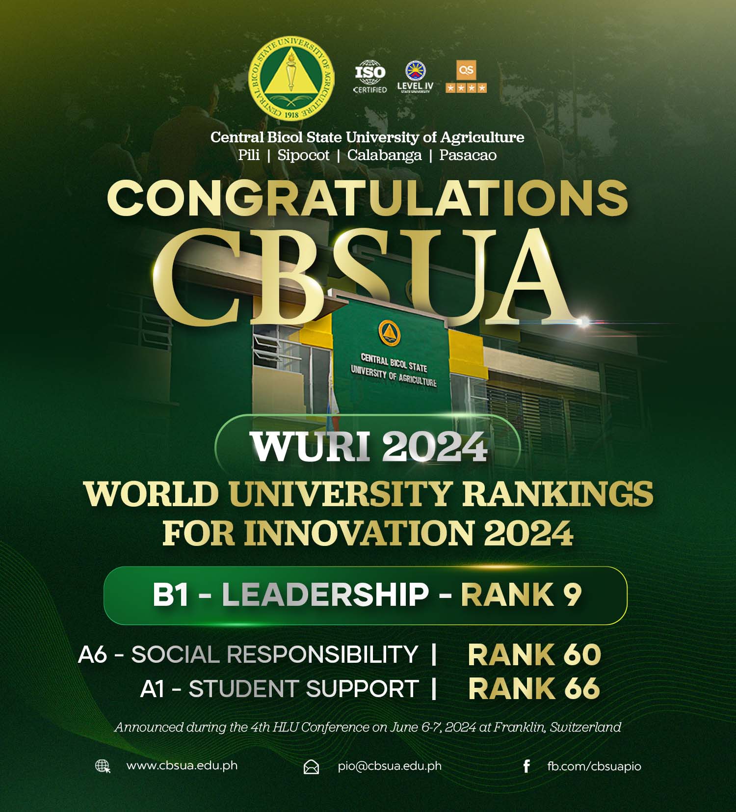 The Central Bicol State University of Agriculture received significant recognition in the World University Rankings for Innovation (WURI) in multiple categories during the fourth Annual Conference of the Hanseatic League of Universities Conference hosted by the Franklin University in Switzerland on June 6-7, 2024.